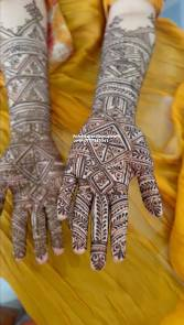 This is the most detailed form, covering the entire front hand with motifs like peacocks, bride-groom figures, mandalas, and temple shapes. The designs often reach up to the elbow or even beyond, making them ideal for bridal wear.
