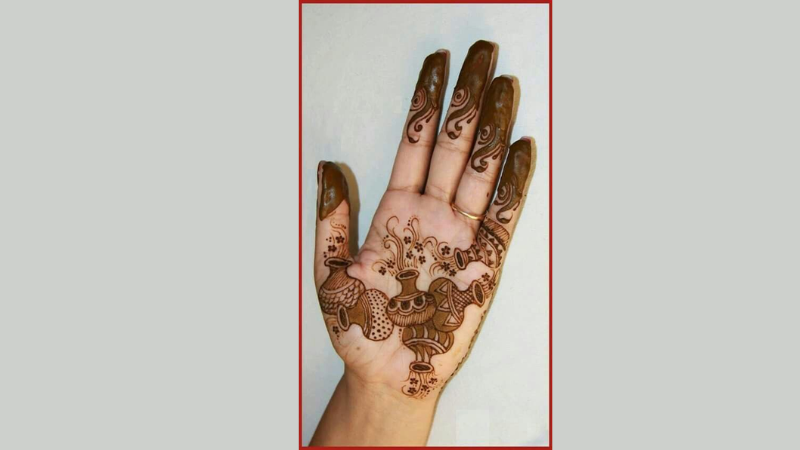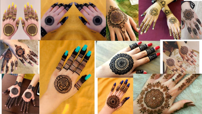 Round Tiki Design is an ancient and popular style in Pakistan. This design usually consists of a round takiya between the hands, and around it is a pattern of various small flowers or vines. This design is simple and beautiful and can be made on wedding, Eid or any festival.
