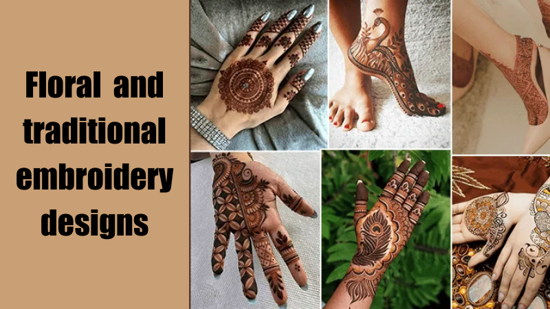 Floral and embroidery designs are famous in different regions of Pakistan. These designs incorporate small flowers, plants, and specific symbols that reflect our cultural heritage. In this design, the prints are quite subtle and complete designs are made on the hands and feet.